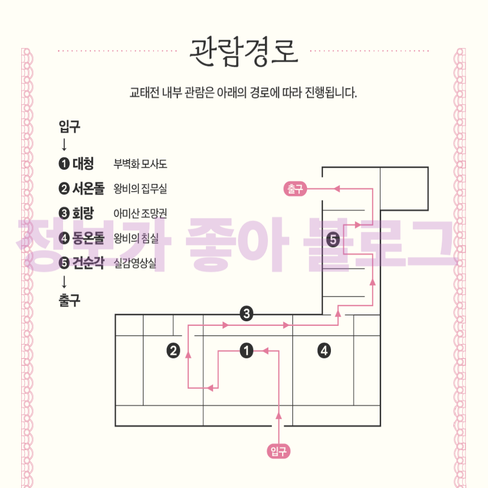교태전 내부를 아래 동선을 따라 이동하며 관람합니다.